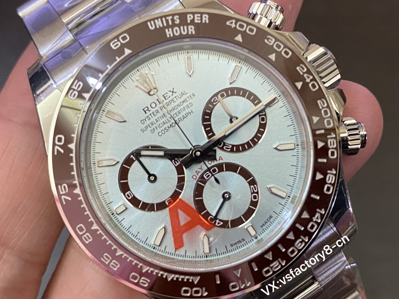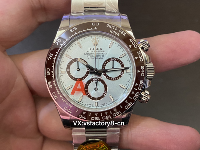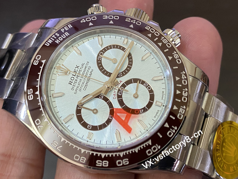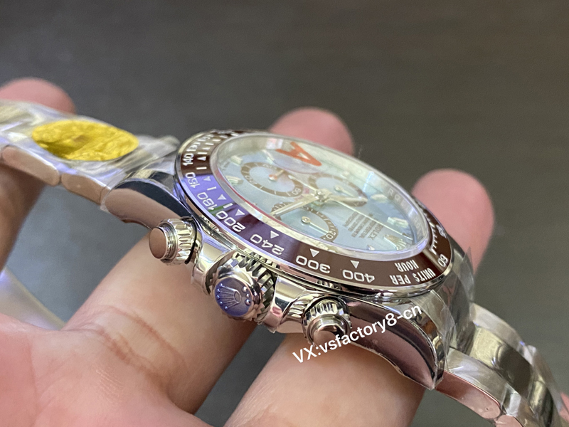 VS厂劳力士冰蓝面迪通拿表盘蓝色太阳纹普刻区别于钻刻,蓝色太阳纹更加沉稳大气,棕色陶瓷圈依旧单独调色。