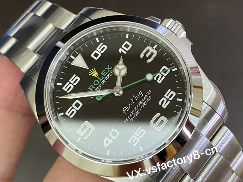 VS厂劳力士40m空中霸王型复刻表采取了2020年最新版正品开发复刻,表盘上采取了黑色搪瓷还原,1点钟刻度由原“5”变更为“05”,与左侧的“55”相呼应,搭配了原版一致绿色秒针,盘面“ROLEX”劳力士字体复刻一致绿色,盘面印刷字体做工细节非常立体,采取了实心中轴,并非空心管,指针和刻度打磨圆润,均填充了瑞士夜光粉涂层,细节做工上做到了原汁原味。