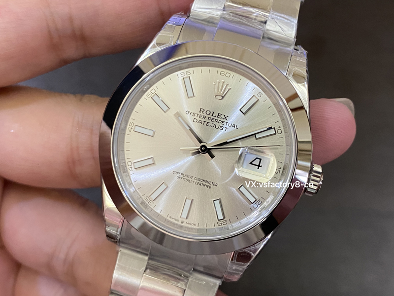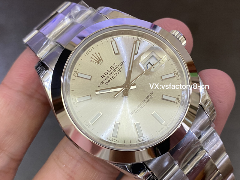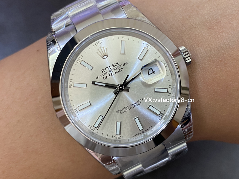 VS厂在劳力士日志同步了正版一致放射纹银盘还原,VS厂在这款劳力士41m银盘日志复刻表的制作上,一丝不苟,展现了高超的工艺,指针与时标的抛光工艺非常出众,阳光下闪耀着金属光泽,极具视觉冲击力,十二点则是大皇冠LOGO,立体感强烈,采取了实心中轴,刻度和指针边缘打磨圆润,表盘英文字体印刷非常细腻,彰显了VS厂细节做工非常高,也证明了此款复刻表非常值得入手。