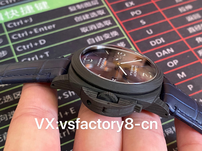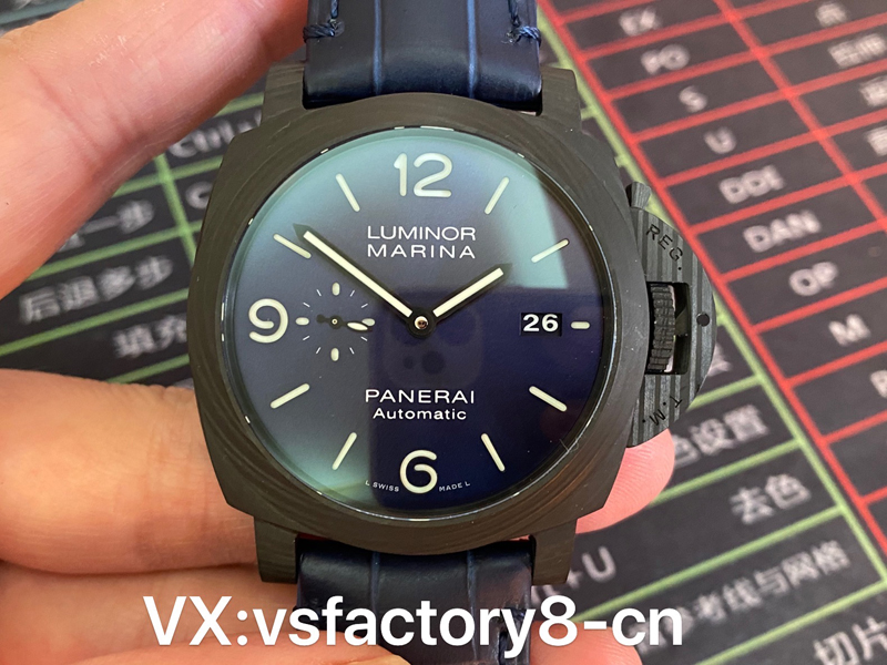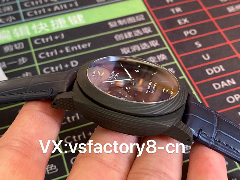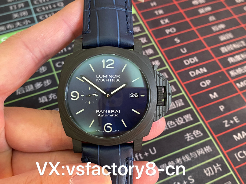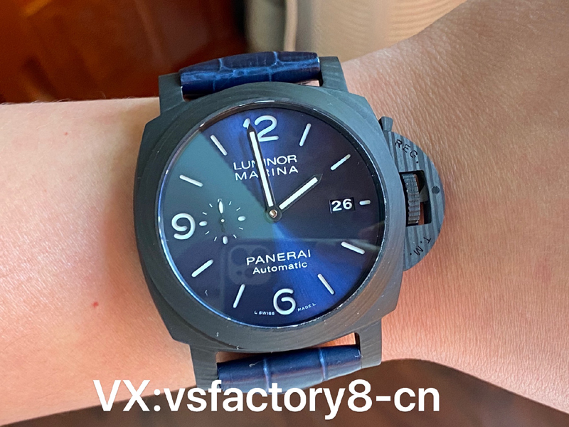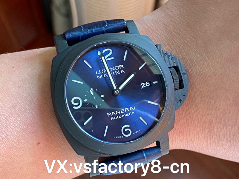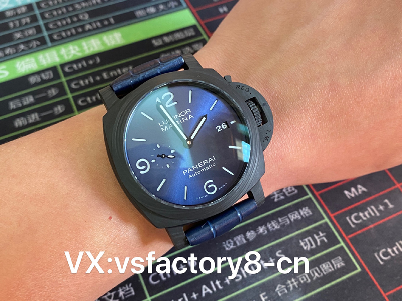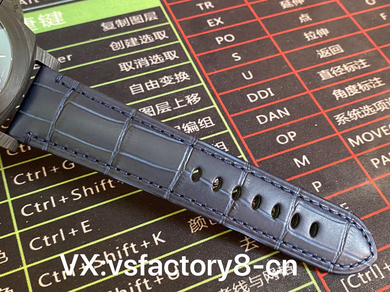 VS厂手表沛纳海PAM1664采用轻量化碳纤维表壳,首款配备经典三明治蓝色表盘搭配超级夜光涂层伴您潜入深海,搭配蓝色竹节纹小牛皮。